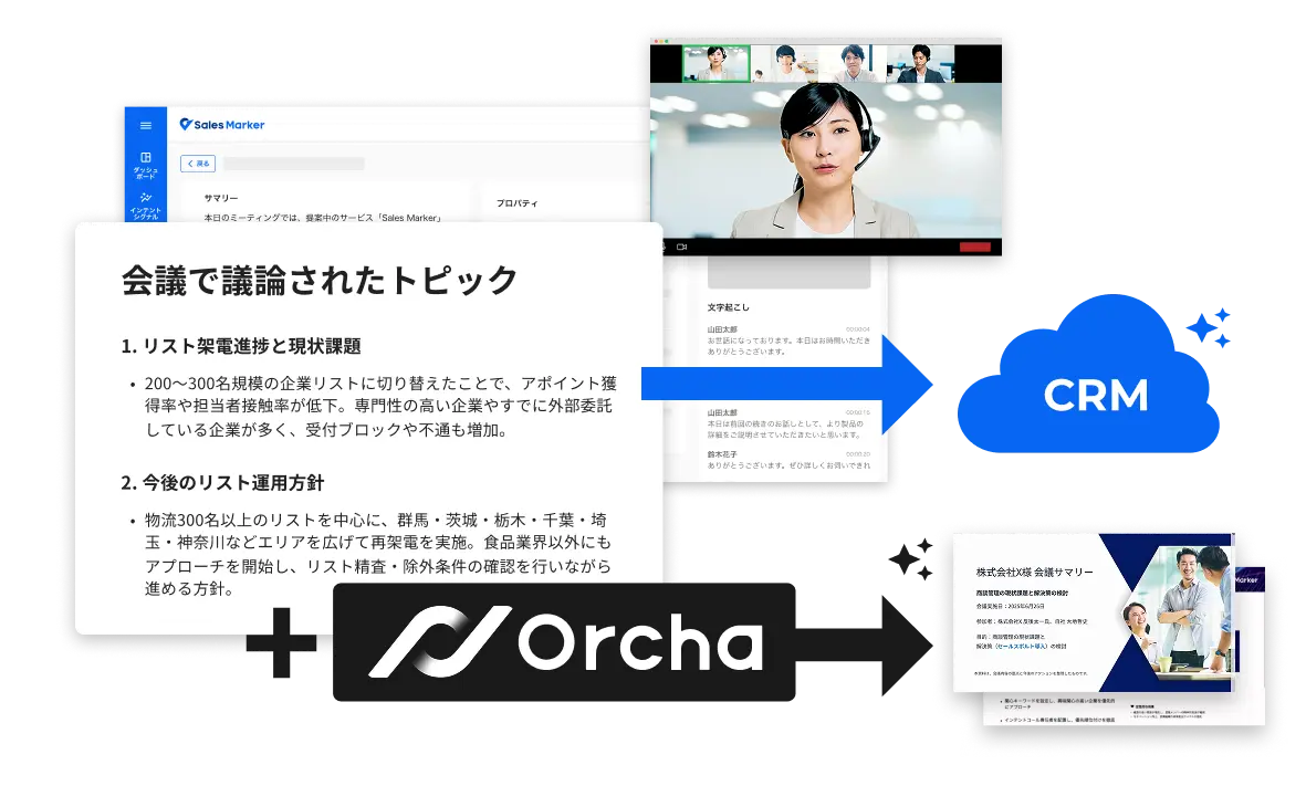 さらにマルチAIスーパーエージェント「Orcha(オルカ)」が加わることで、商談動画から相手の関心や課題を読み取り、提案資料やお礼メールを自動作成。営業は資料づくりから解放され、“考えること”に集中できるようになります。