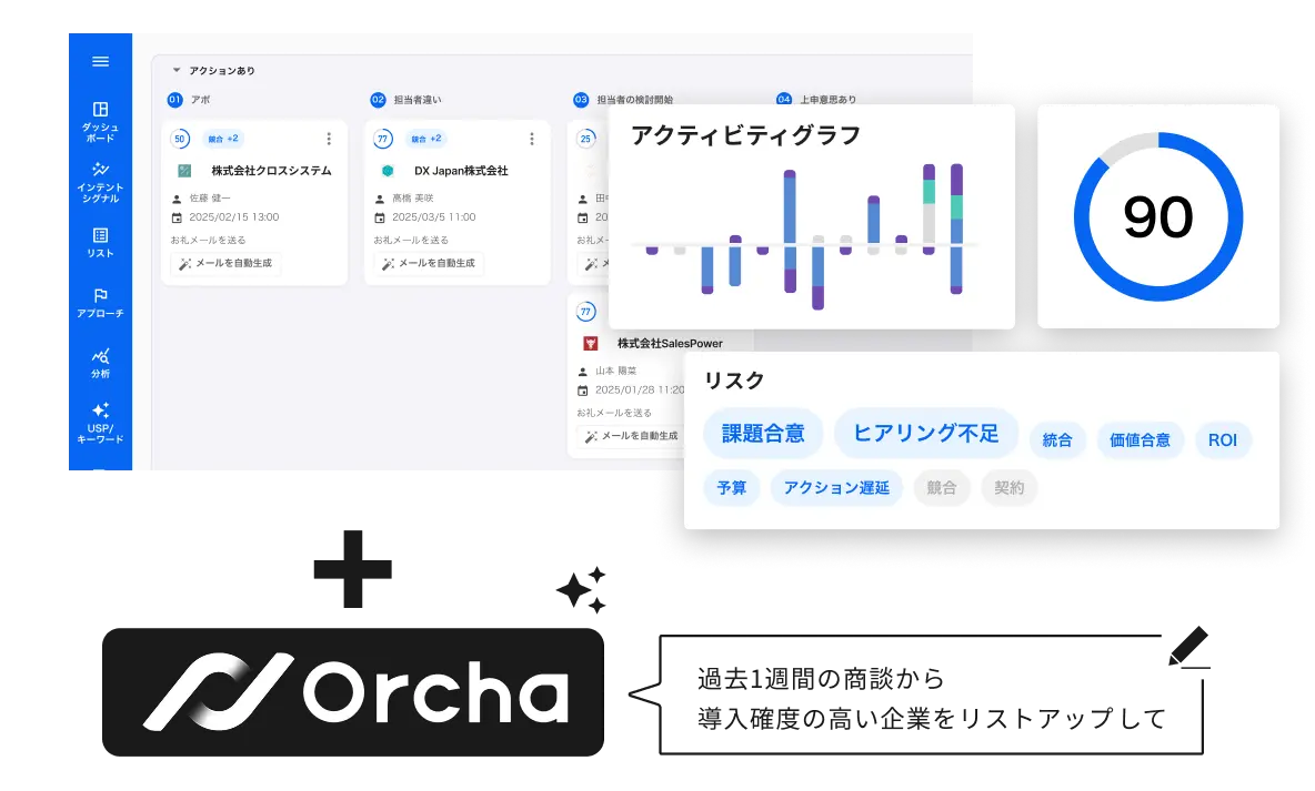さらにOrcha(オルカ)を活用することで、煩わしいデータ抽出を削減。例えば、「過去1週間の商談から導入確度の高い企業をリストアップして」と依頼するだけで、即時にデータを抽出し分析に活かせます。