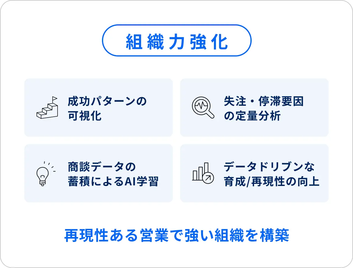 記録が“活用できる営業資産”へと変わり、精度の高いフォローアップと再現性のある営業活動を実現します。