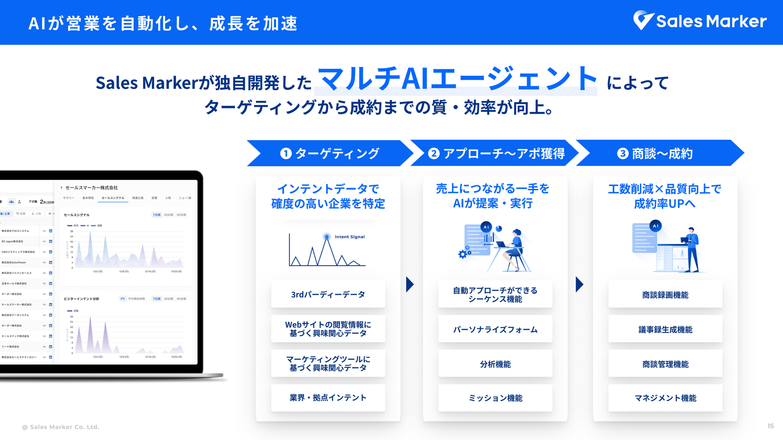 Sales Markerに蓄積されたインテントデータと営業活動データをもとにAIエージェントが商談獲得につながる"勝ちパターン"を学習し続けることで、営業プロセス全体を効率化し成果につながる行動を提示。「誰に・いつ・どんな内容で」アプローチすべきかを導き出し、ターゲット選定・タイミングの見極め・提案内容の生成から、実際のアクションまで自律的に実行します。属人的なスキルや経験に依存せず、誰が取り組んでも同じように成果を再現できる営業組織へと進化させることができます。