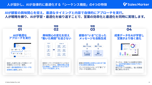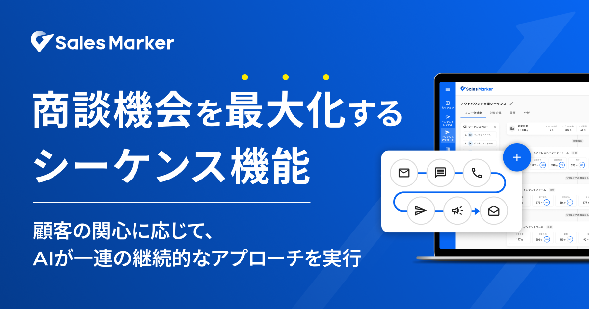 顧客の興味関心に応じて、「誰に・いつ・どんな内容で」アプローチすべきかをAIが導き出し、自律的に実行するSales Markerのシーケンス機能。