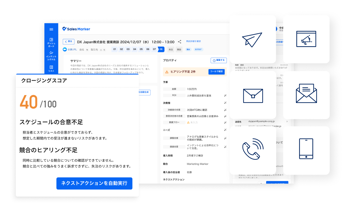 商談サマリー・インテント・停滞リスクをもとに、AIが最適なNext Actionを自動生成します。フォローメール文面、リマインド、提案案内、アポイント調整など、商談後に発生する一連の行動が自動で揃うため、担当者ごとの判断のバラつきがなくなり、“抜け漏れゼロ”の営業活動が実現します。
