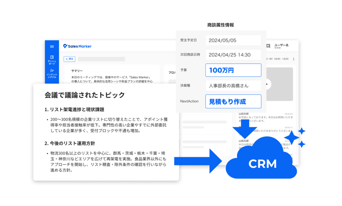 AI MeetingとCRMの情報が双方向に同期されることで、入力作業、抜け漏れ、記録のバラつきが解消。AIが整えた“正しいデータ”が常にCRMに蓄積されるため、NO CRM運用が現実になります。その結果、現場の負荷が劇的に減るだけでなく、組織全体の判断精度が向上します。