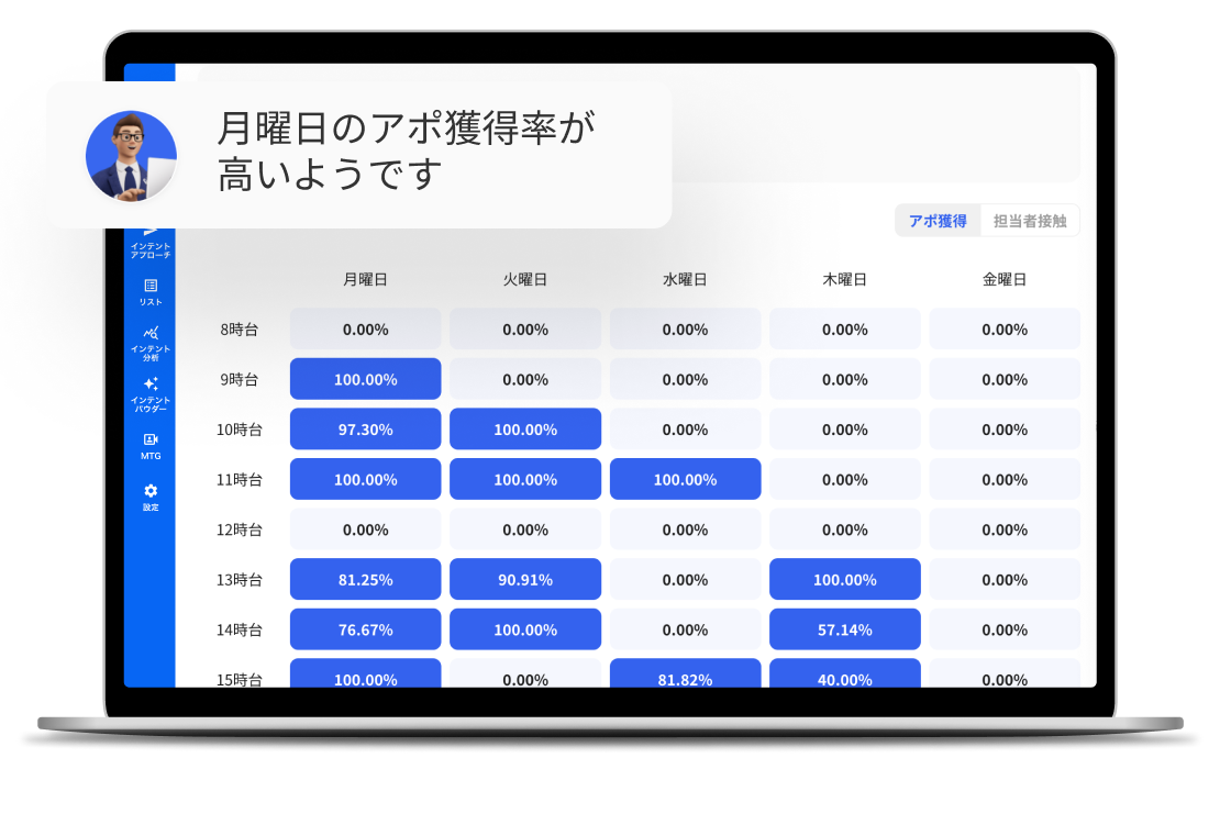 見込み顧客とつながりやすい曜日・時間帯を自動で分析し、わかりやすく可視化。これまで担当者の勘や経験に頼っていた「いつコールすべきか」を、データドリブンに把握できます。傾向をもとに最適なタイミングでアプローチすることで、接続率や商談化率の向上につながります。