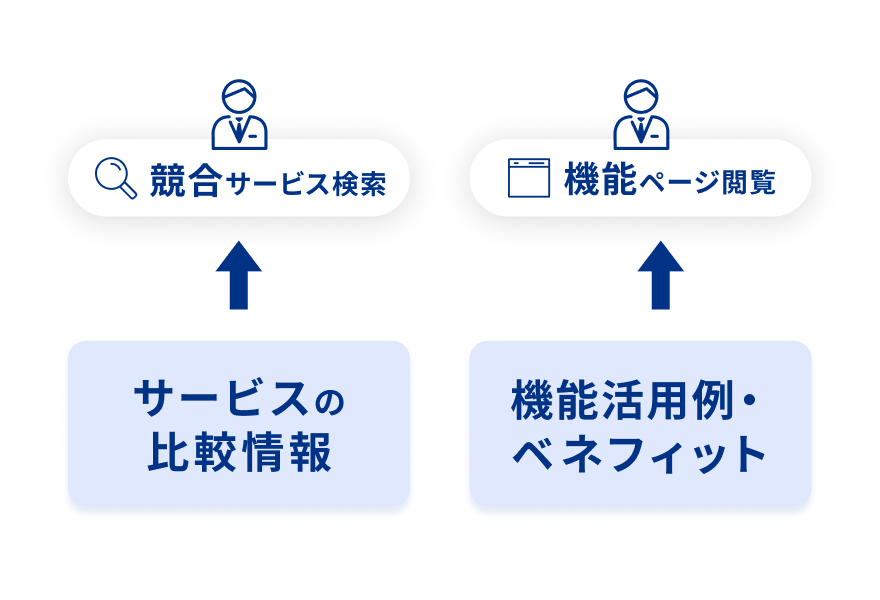 例えば、競合サービスを検索した企業には比較情報を、「機能ページ」を訪問した企業には、その機能を活用することで得られるベネフィットを、──このように、興味関心に応じて事前に設定した文面を自動で出し分けます。