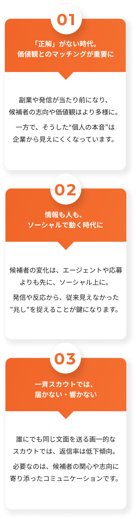 候補者の変化は、エージェントや応募よりも先に、ソーシャル上に表れます。 ソーシャルプラットフォーム上での発信や反応など、従来見えなかった”兆し”をとらえることが鍵になります。