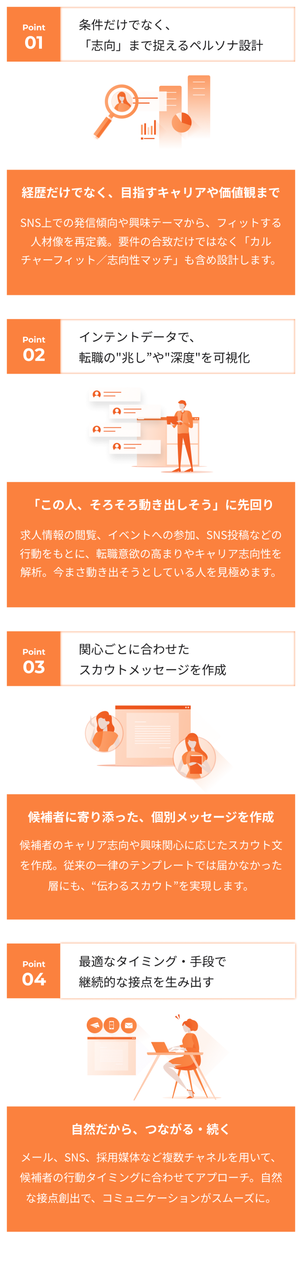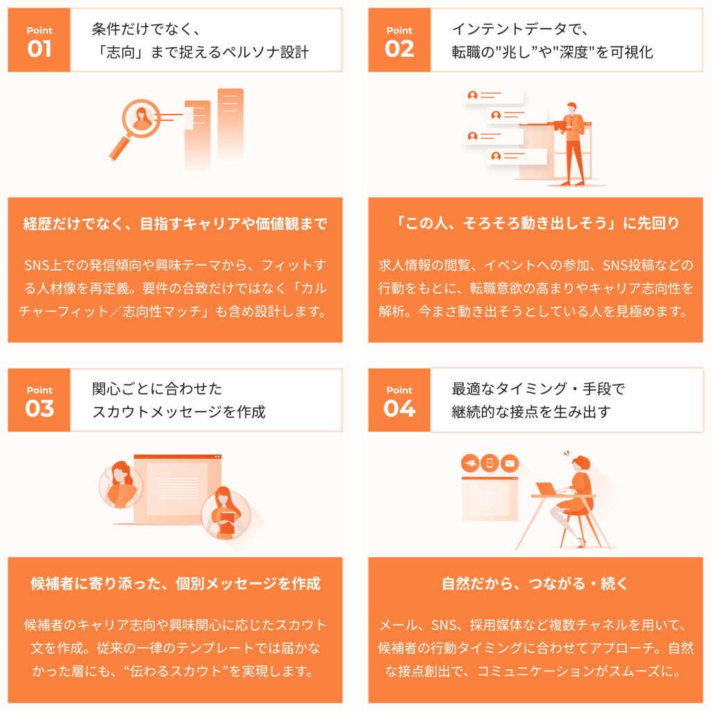 “今まさに動き出そうとしている人材”と自然につながる── それを実現するインテントリクルーティングにおいて、欠かせないのが以下の4つのポイントです。