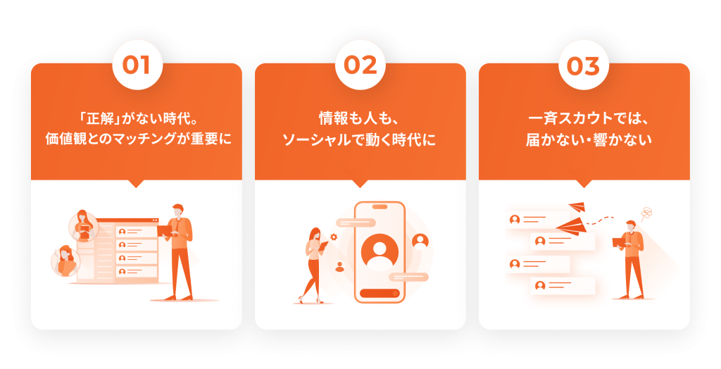 従来のダイレクトスカウトやエージェント経由のアプローチでは、企業側の一方的なメッセージや一律の求人情報が主流。そのため、候補者の興味関心にフィットせず、応募に至らないケースも少なくありません。