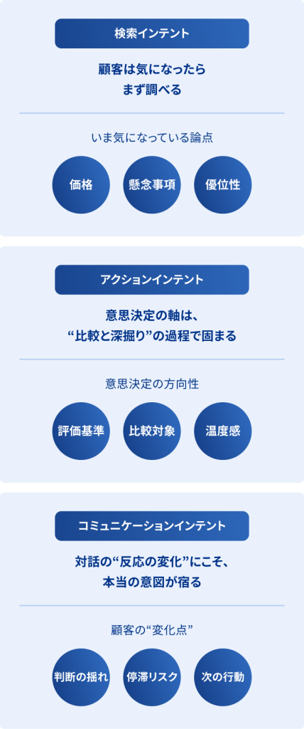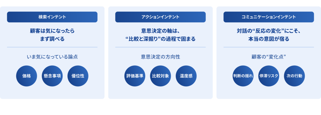 これは単なる分類ではなく、分断されがちな検討プロセスを“つながった理解”に戻すためのフレームです。それぞれが補完し合い、3つがそろうことで、顧客の判断の背景や優先度の変化が立体的に見えるようになります。