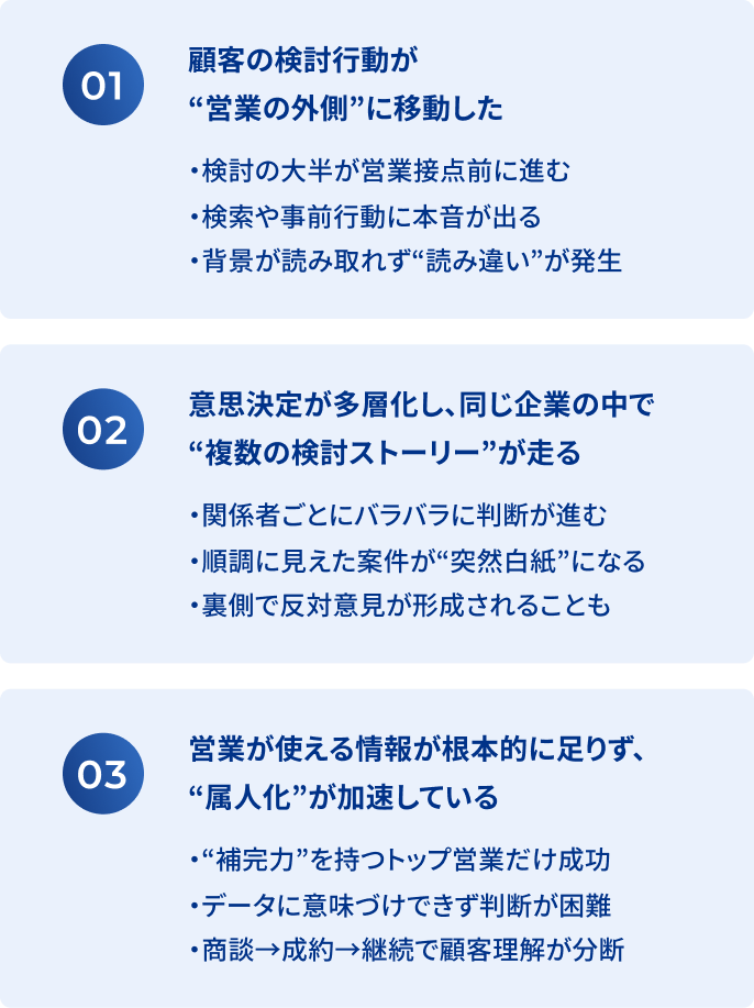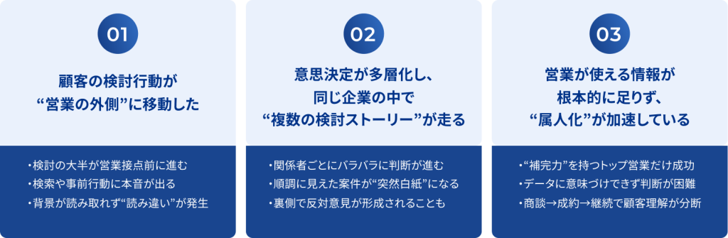 顧客は営業と会う前に、課題の明確化・比較・調査を静かに進めています。商談の場で語られる内容は「表面」だけで、その裏には営業の視界に入らない動きが大量に存在します。このギャップが、読み違いや提案のズレにつながります。