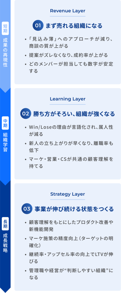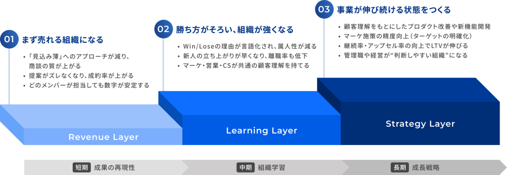 3つのインテントがつながると、「なぜ勝ったのか」「なぜ負けたのか」が明確になります。これは個人の感覚ではなく、行動データ × 商談データ × 反応データ から読み取れる“根拠”です。その結果、組織全体で勝ち方がそろうという中期的な飛躍が生まれます。