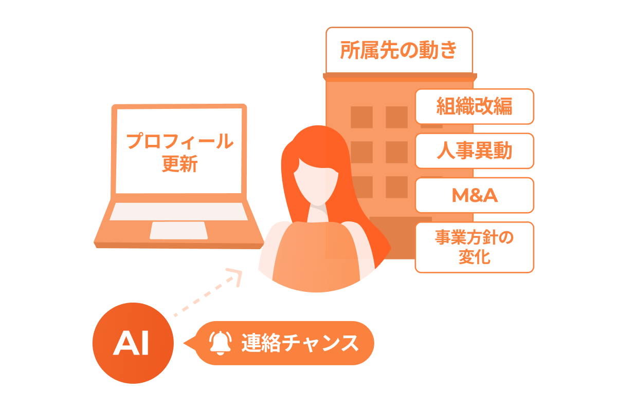 SNSでの発信やプロフィールの更新、情報閲覧の動きから、転職意欲が高まり始めた"兆し"を検知。「誰を」「いつ」スカウトすべきかを可視化します。さらに、候補者の所属企業の動向(例:組織改編・人事異動・M&A・事業方針の変化)もインテントとして取り込み、個人の変化 × 所属企業の変化の両面から"今"の確度を見極めます。まだ転職市場に現れていない段階で先んじて接点を創ることで、返信率・面談化率・紹介決定率の向上が期待できます。