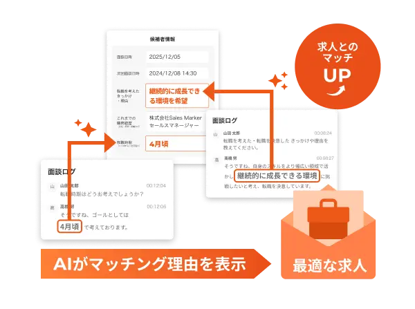 面談を解析し、要点・懸念点・マッチング理由などをAIが下書き生成。担当者は微調整するだけで面談後の準備が完了します。提案スピードが上がり、機会損失を最小限に。