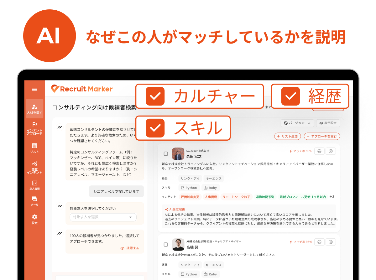 推薦された候補者について「どの点がマッチしているのか」をAIが説明。納得感を持って判断できるだけでなく、フィードバックが学習され、次回以降はより自社の採用基準に即した候補者が提案されるようになります。