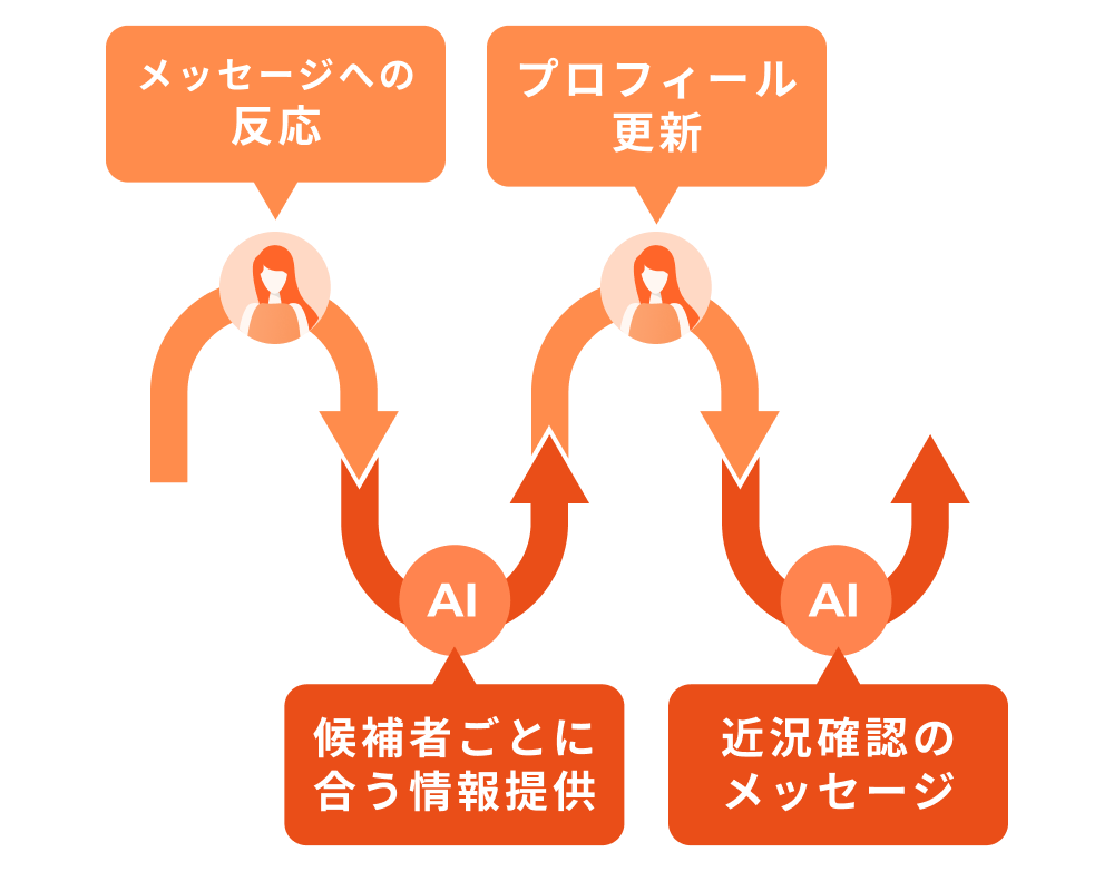 検索行動やSNSプロフィールの更新など、転職意欲の“兆し”をAIが自動で検知。面談打診、フォローアップまで、候補者の状況に応じて最適なアプローチを自動で実行します。