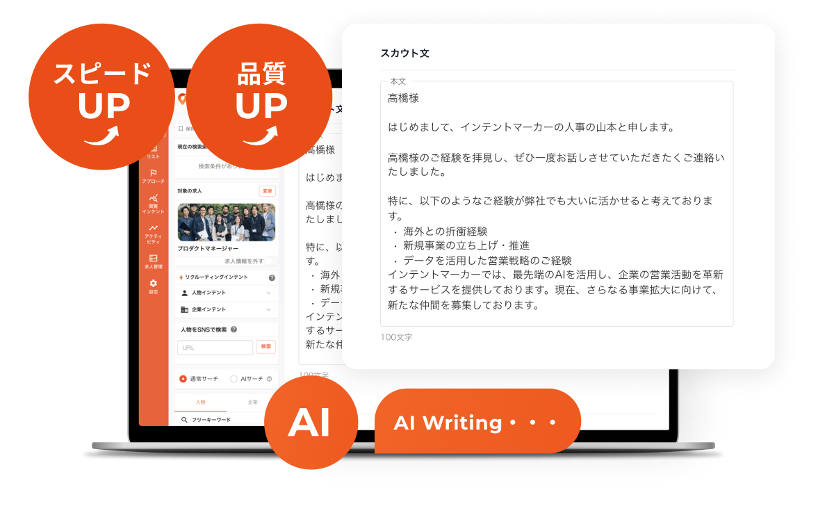 候補者が所属する企業のニュースや、個人SNS更新などのインテントデータから、転職意欲の兆しをAIが検知。