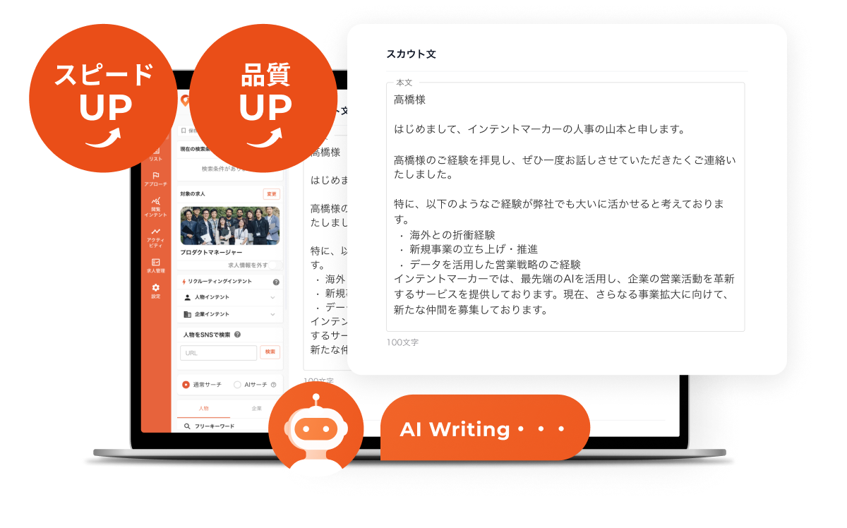 候補者が所属する企業のニュースや、個人SNS更新などのインテントデータから、転職意欲の兆しをAIが検知。