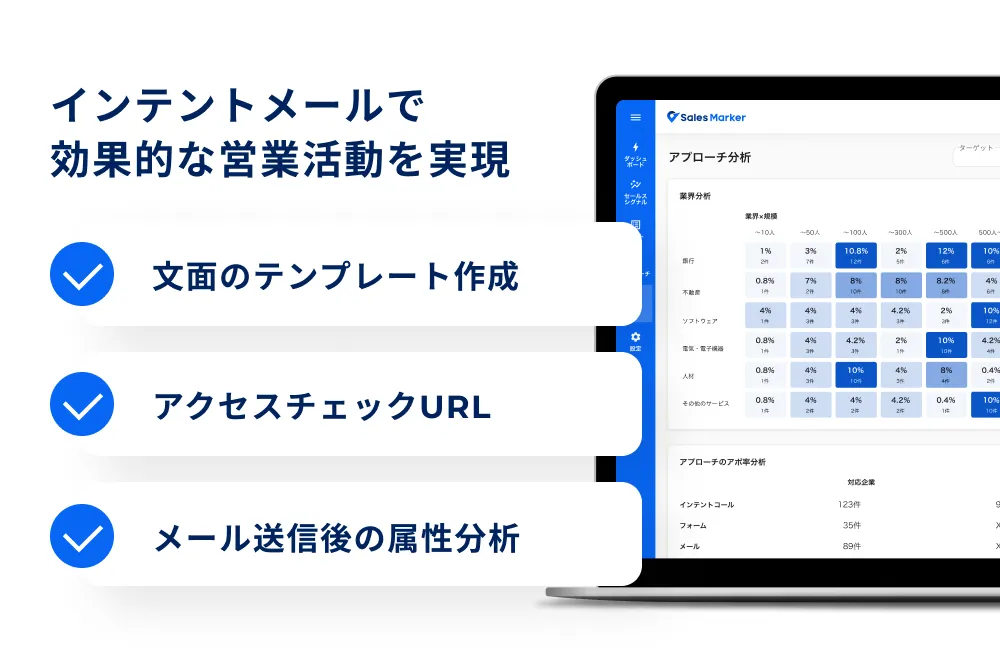 企業に対する効率的なアプローチを模索している方には、Sales Markerのインテントメール機能が最適です。電話でのアプローチが難しいリモートワーク環境でも、インテントデータを活用したメールでターゲット企業と効果的に接点を持てます。さらに、メールに資料を添付することで興味を引き、潜在的なニーズを引き出すことも可能です。送信後のメール分析機能を使えば、企業の規模や業種ごとの反応傾向を把握し、マーケティングや営業活動の精度を高められます。