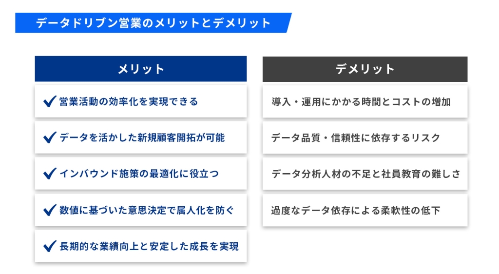さらに、データに基づく意思決定は社内外への説明責任を果たしやすく、組織全体で共通認識を持ちながら営業活動を進められる点も大きなメリットです。