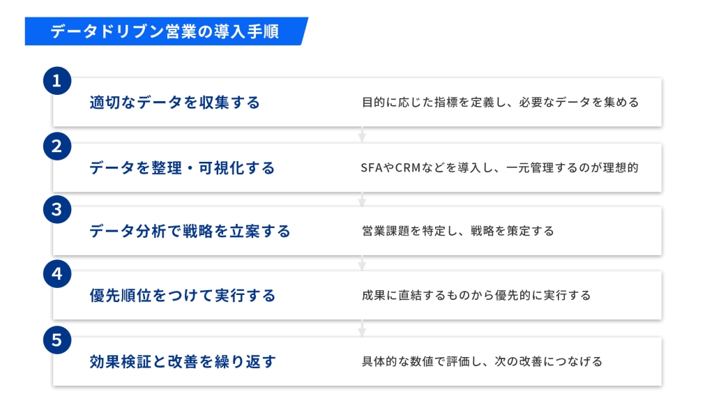 データドリブン営業を成功させるには、明確な目的を設定し、戦略的にデータを活用することが重要です。ここでは、実践的な5つに分けて導入手順を解説します。