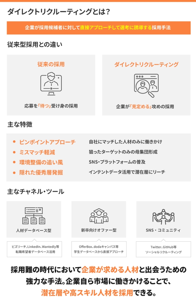 一方、ダイレクトリクルーティングは企業側から声をかけるため応募数自体は絞られますが、その分母集団の質が高い状態で選考に臨めます。求人広告は短期的な大量募集に向いており、ダイレクトリクルーティングは特定人材の効率的な獲得に向いていると言えます。