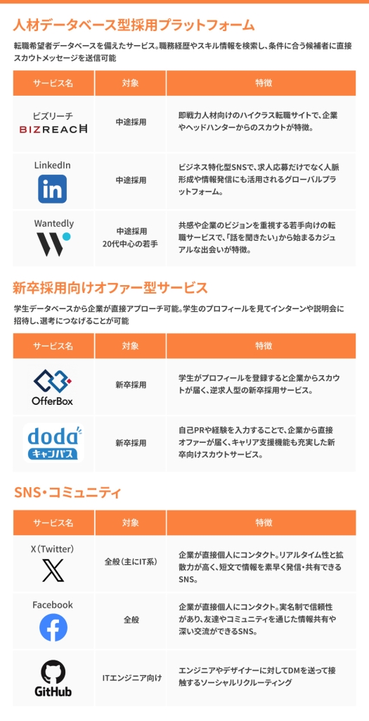 ダイレクトリクルーティングを実践するにあたっては、いくつかのチャネルやツールを活用できます。主な種類と特徴は以下のとおりです。