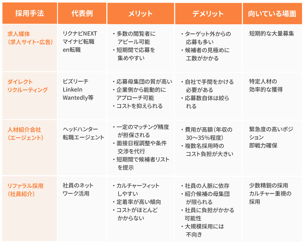 ただし短期で結果を出す必要がある場合や社内リソースが不足している場合は他の手法の方が適することもあります。自社の状況に合わせて最適な手法を選択・併用し、採用成功率を高めていきましょう。