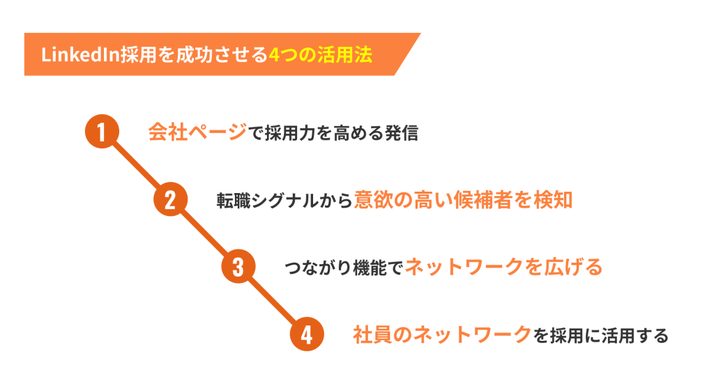 LinkedInを戦略的に活用すれば、優秀な人材との出会いを創出し、採用活動を大きく効率化できます。ここでは企業の採用担当者向けに、具体的な活用方法を4つのステップで解説します。