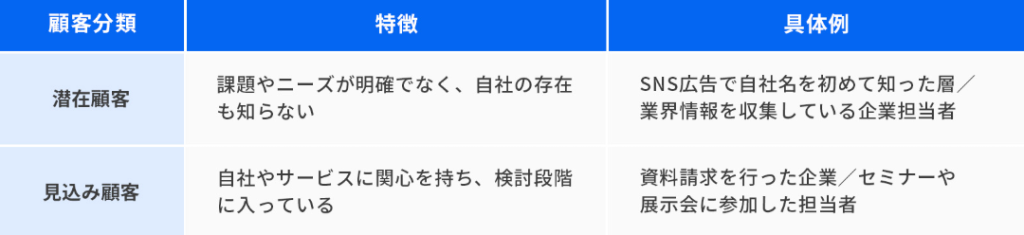 見込み顧客と潜在顧客はいずれも、将来的に自社の商品やサービスを購入する可能性のある層ですが、関心度や購買意欲の段階に明確な違いがあります。潜在顧客はまだ課題を自覚していない段階にあり、見込み顧客は課題解決のための情報を積極的に集め始めています。