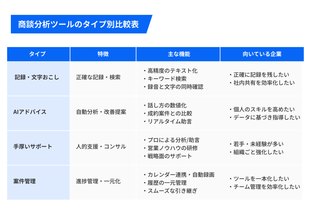 商談分析ツールには、それぞれ得意とする機能や特徴があります。自社のニーズに合わせて選ぶことが大切です。ここでは、商談分析ツールを4つのタイプに分けて、それぞれの特徴を解説します。