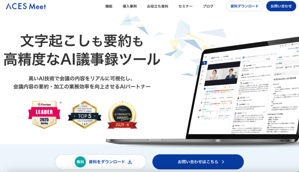 ACES Meetは文字おこし特化型のツールで、高精度の音声認識エンジンを搭載しています。ビジネス用語や専門用語も正確に認識でき、話者ごとに発言を自動分離する機能を備えています。キーワード検索機能により、過去の商談から必要な情報をすぐに見つけられるため、商談内容を正確に記録・共有したい企業におすすめです。