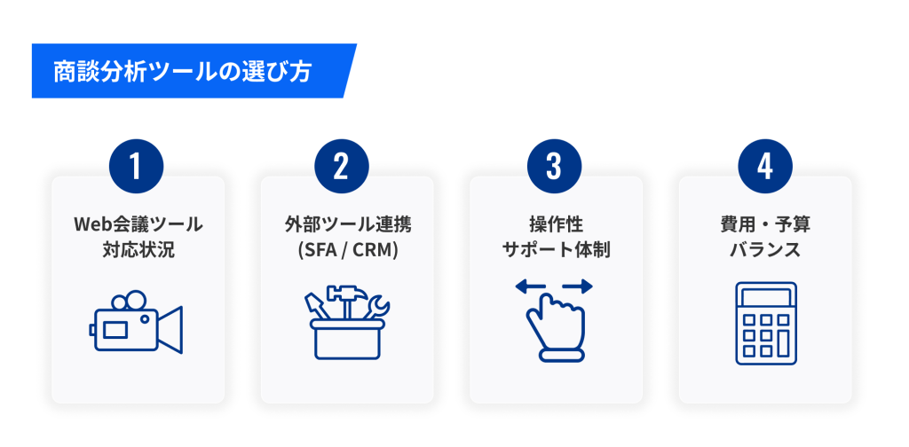 商談分析ツールを選ぶ際は、自社の営業スタイルや既存のシステムとの相性を考えることが大切です。ここでは、ツール選びで確認すべき4つのポイントを解説します。