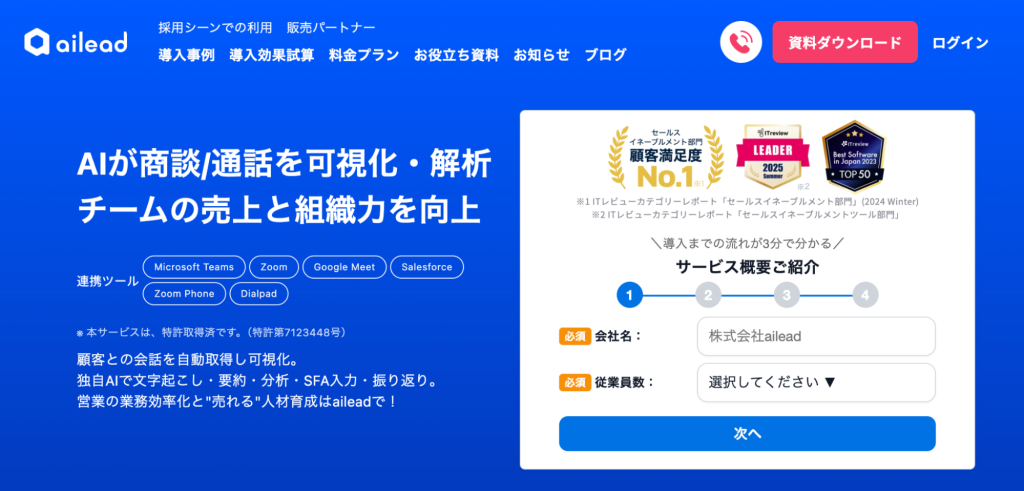 SFAとの自動連携機能もあるため、入力作業の効率化も実現できます。初めて商談分析ツールを導入する企業や、まずは小規模でスタートしたい企業におすすめです。無料トライアルを活用して、費用対効果を確かめてから本格導入することもできます。