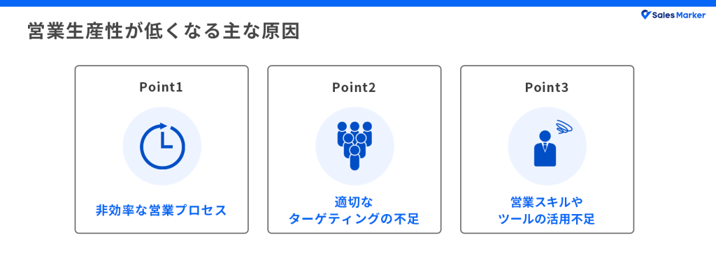 ここでは、営業生産性が低下する主な原因を3つに分けて解説します。
