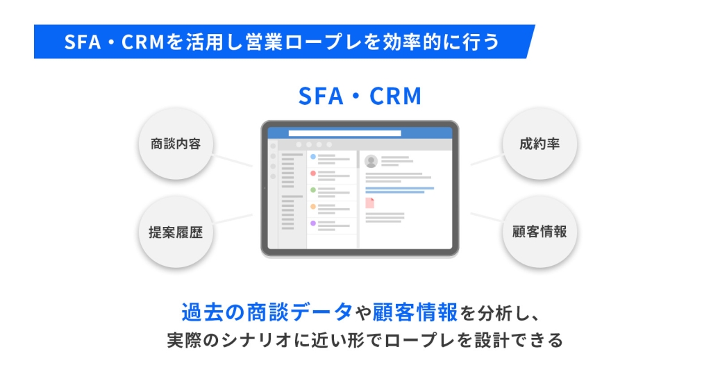 商談内容・提案履歴・成約率などを分析することで、成果につながったトークパターンを抽出することも可能です。ロープレの練習テーマをデータに基づいて設定することで、より実践的で再現性の高いトレーニングが行えるでしょう。