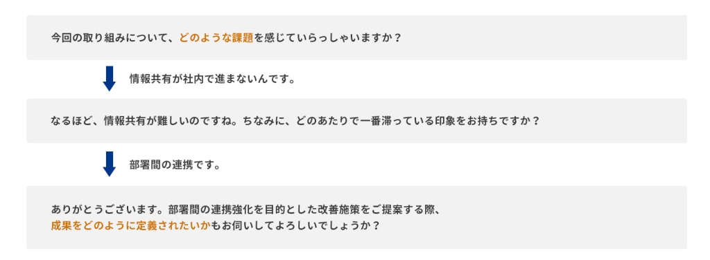 ヒアリングでは、「現状→課題→理想像」の順で質問を重ねると、相手の思考が整理されやすくなります。質問の意図を明確にし、相手が話しやすい空気をつくることで、より深い情報を引き出せます。