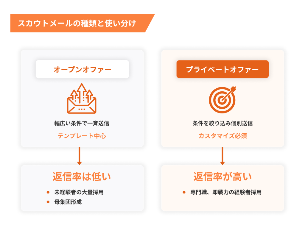 スカウトメールには、大きく分けて2つの種類があります。それぞれの特徴を理解して、状況に応じて使い分けることが効果的です。採用の目的や、確保したい人数によって、適した手法は変わります。
