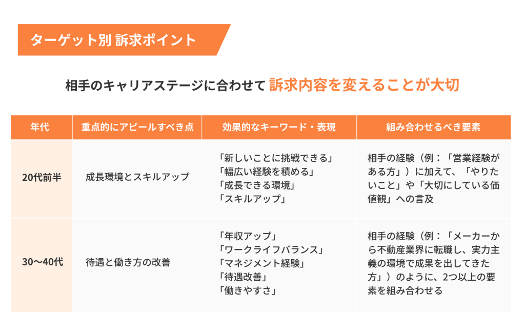 スカウトメールは、相手によって響くポイントがちがいます。年代や性別、キャリアステージに応じて、訴求内容を変えることが大切です。