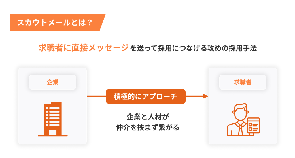 スカウトメールとは、企業が求職者に直接メッセージを送って採用につなげる手法です。従来の「求人を出して応募を待つ」スタイルとはちがい、企業から積極的にアプローチできる点が最大の特徴となります。